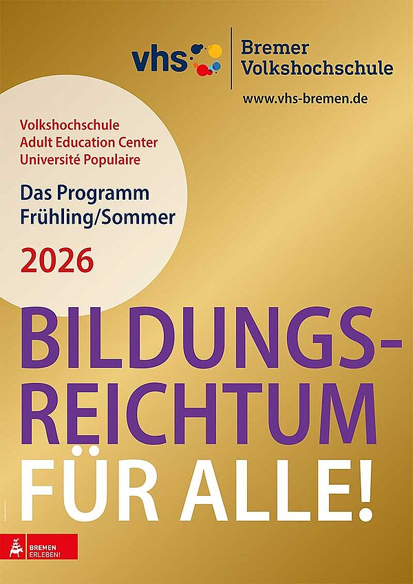 Am Donnerstag, 18. Dezember 2025 erscheint das neue Programmheft der Bremer vhs für das Frühjahrs-/Sommersemester 2026. Ab diesem Tag finden Sie das komplette Kursangebot als PDF auf unserer Website – inklusive der Möglichkeit zur direkten Online-Anmeldung.